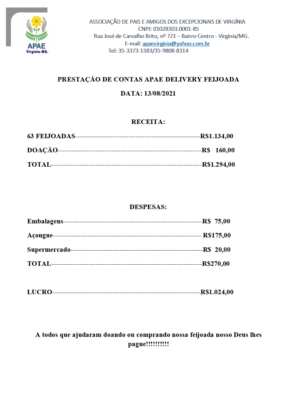 Prestação de contas do Delivery Feijoada realizado dia 13/08/2021
